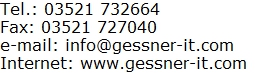 Impressumgeßner IT-systemsDresdner Str. 16 01662 Meißen geschäftsführender Gesellschafter: André Geßner mit Gewerbeerlaubnis vom Dez. 1992 ![]() Betriebsnummer 12280394 Umsatzsteuer-Identifikationsnummer gemäß § 27 a Umsatzsteuergesetz: DE250698941. Steuernummer 209/223/07181 Gerichtsstand Meißen Haftungshinweis: Trotz sorgfältiger inhaltlicher Kontrolle übernehmen wir keine Haftung für die Inhalte externer Links. Für den Inhalt der verlinkten Seiten sind ausschließlich deren Betreiber verantwortlich. |